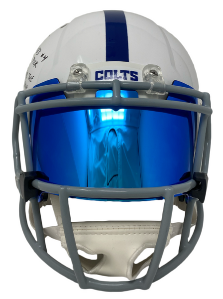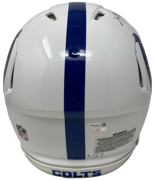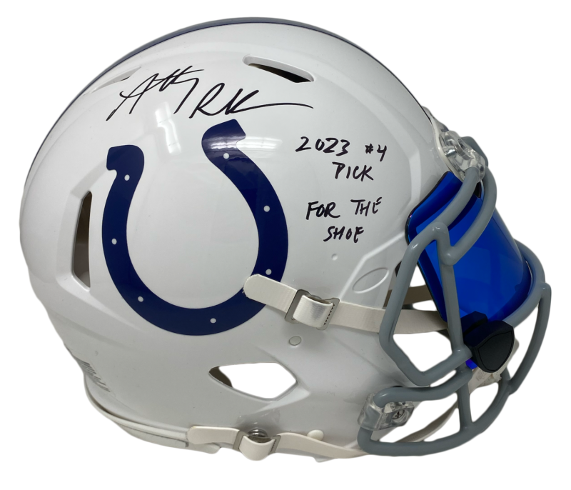 This authentic helmet has been personally hand-signed by Anthony Richardson with the added inscription "2023 #4 Pick" & "For the Shoe." It is officially licensed by the National Football League and comes with an individually numbered, tamper-evident hologram from Fanatics Authentic. To ensure authenticity, the hologram can be reviewed online. This process helps to ensure that the product purchased is authentic and eliminates any possibility of duplication or fraud. This helmet is limited to just 23 and you are bidding on number "3" from the edition. MONEY BACK GUARANTEE! If for any reason you are not completely satisfied with the quality or authenticity of your purchase, we will gladly give you a full refund or exchange, whichever you prefer up to 30 days after purchase. Please feel free to e-mail us with any questions. Thank you. Authenticator Pre-Certified Authenticator: Fanatics Authenticated History of item: Anthony Richardson has signed this item in the presence of a representative from Fanatics Authenticated. Describe how you came to possess this item: Super Sports Center is a fully authorized dealer for Upper Deck Authenticated as well as Mounted Memories and Steiner Sports. Other information about you and / or the item: Super Sports Center strives to deliver the most authentic in sports memorabilia from trusted companies like Mounted Memories, Steiner Sports and Upper Deck Authenticated. If it exists, we can find it for you!