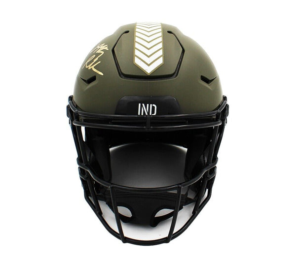 An Indianapolis Colts Speed Flex Authentic Salute to Service NFL Helmet hand signed by Anthony Richardson. The item and signature are in excellent condition. Anthony is a football quarterback for the Indianapolis Colts. He played college football for the Florida Gators. AUTHENTICATION: The item is accompanied by a Fanatics Authentic Serial Numbered and Databased Hologram.