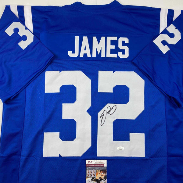 Autographed/Signed Edgerrin James Indianapolis Blue Football Jersey JSA COA Jersey has no brand names or logos. This is a custom jersey and was not manufactured by or in any manner associated with any professional sports league or manufacturer. This custom jersey carries no professional sports league designation. The item is intended to be an autographed collectible. The custom jersey displays the name and number of the player. This item in no way is affiliated with or connected to any professional sports organization. Size is XL.