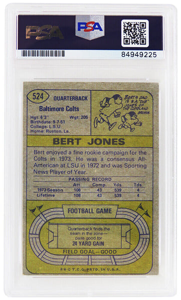 Bert Jones signed Colts 1974 Topps rookie football trading card #524 with '76 MVP' inscription. The card has been authenticated and encapsulated by PSA/DNA and the number can be verified online. The image of the item is a stock photo, as we may have multiples of the item in stock. The Slabbed Card you will receive will be of the card described. (Same grade, Same authentication) You may or may not receive the exact PSA serial number on the slab label shown in image.