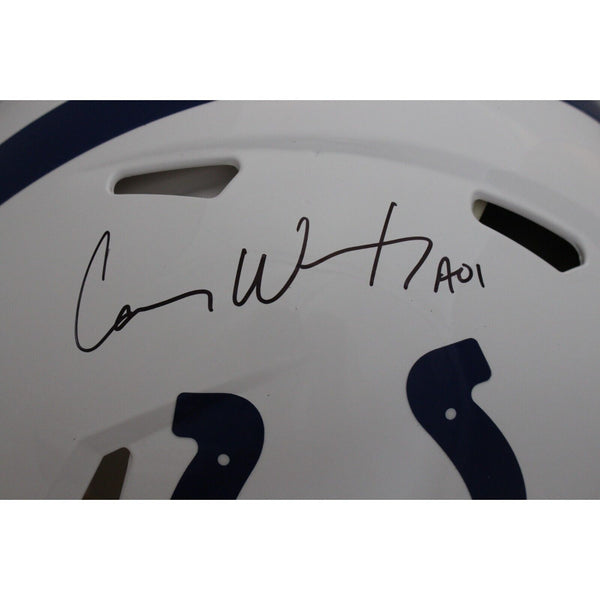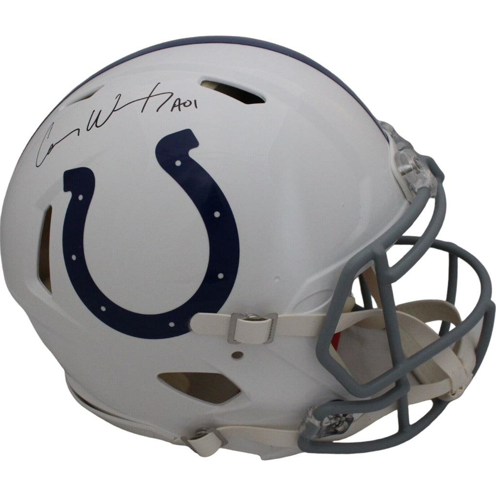 The number in the listing title is just an inventory sku for our records and is not the authentication number. The item pictured is the exact item you will receive, please see photos for condition. This is an Indianapolis Colts Authentic Full Size Helmet that was personally autographed by Carson Wentz with "AIO" inscription. Includes a certificate of authenticity from Fanatics Authentic (FAN) and Denver Autographs.