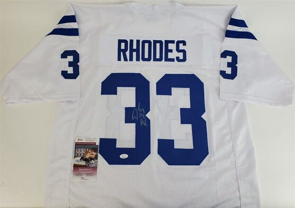 This autographed jersey has been personally hand-signed by Dominic Rhodes of the Indianapolis Colts. This autograph is certified by James Spence Authentication's (JSA) Witnessed Protection Program. That means that a JSA representative was present when this item was signed. It comes with the numbered hologram and matching Certificate of Authenticity.Custom on-field style jerseys are a more affordable option for autograph seekers. These jerseys do not have any brand name or tags and are made in the Philippines. They feature stitched on names and numbers and are made to look very similar to the on-field jerseys that the players wear. These custom jerseys are very commonly used in the memorabilia industry.
