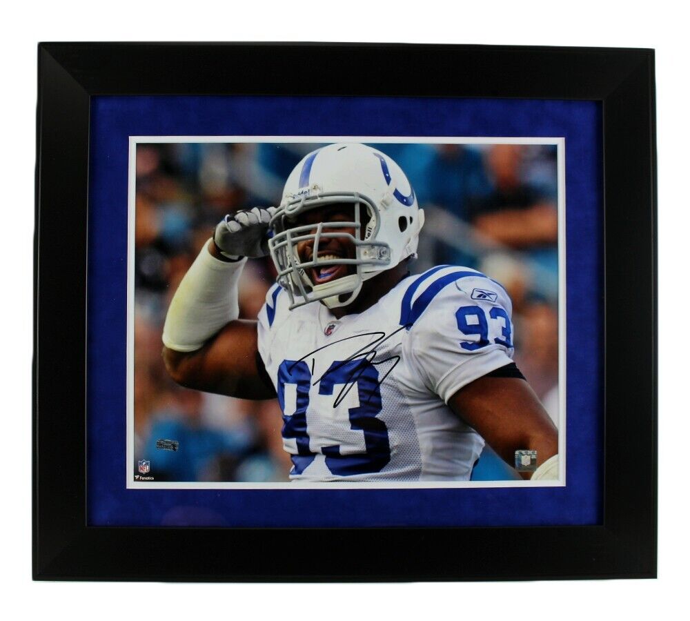 An Indianapolis Colts Framed 16x20 NFL Photo hand signed by Dwight Freeney. The item and signature are in excellent condition. The frame measures approximately 24''x28''. Dwight is a former professional football player who was a defensive end for 16 seasons in the NFL. He played college football at Syracuse, where he earned unanimous All-American honors, and was drafted by the Indianapolis Colts in the first round of the 2002 NFL Draft. With the Colts, Freeney won Super Bowl XLI over the Chicago Bears, and made seven Pro Bowls. He is a Super Bowl champion (XLI), 7x Pro Bowler (2003-2005, 2008-2011), and 3x First-team All-Pro (2004, 2005, 2009). AUTHENTICATION: The item is accompanied by a Dwight Freeney Exclusive Certificate of Authenticity - Dwight Freeney Exclusive Serial Numbered and Databased Hologram - Picture of Dwight from the signing