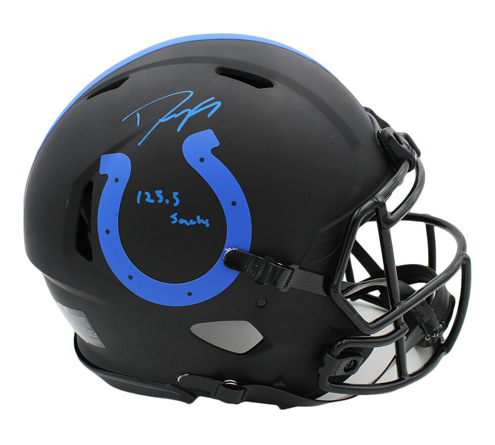 An Indianapolis Colts Speed Authentic Eclipse NFL Helmet hand signed by Dwight Freeney. The item and signature are in excellent condition. In addition to signing his name. Dwight also inscribed "125.5 Sacks" on the item. Dwight is a football defensive end. He was selected in round 1 of the 2002 drafts my the Indianapolis Colts were he spent the majority of his career. He is a SB Champ, 7x Pro Bowler, 3x Firts-Team All Pro, NFL Sacks leader and was on the NFL's 2000s All-Decade Team. AUTHENTICATION: The item is accompanied by a Certificate of Authenticity - Serial Numbered and Databased Hologram - Picture of Dwight from the signing