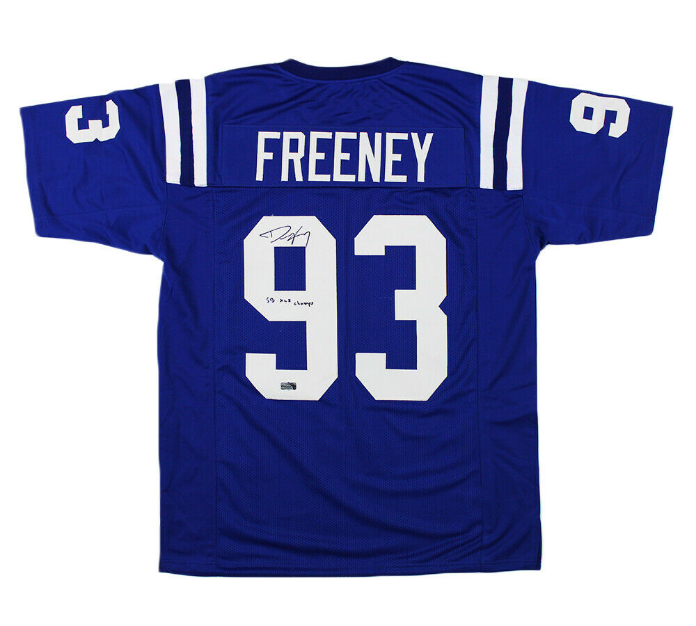 A Indianapolis Custom Blue Jersey hand signed by Dwight Freeney. The item and signature are in excellent condition. In addition to signing his name, Dwight also inscribed "SB XLI Champs" on the item. Dwight was drafted into the NFL in 2002 Round:1,Pick:11.Dwight was Super Bowl champion (XLI).Dwight 3xFirst-team All-Pro (2004,2005,2009).Dwight a Second-team All-Pro (2003).Dwight 7xPro Bowl (2003-2005,2008-2011).Dwight was NFL sacks leader (2004).Dwight was NFL forced fumbles co-leader (2002).AUTHENTICATION: The item is accompanied by a Dwight Freeney Exclusive Certificate of Authenticity - Dwight Freeney Exclusive Serial Numbered and Databased Hologram - Picture of Dwight from the signing
