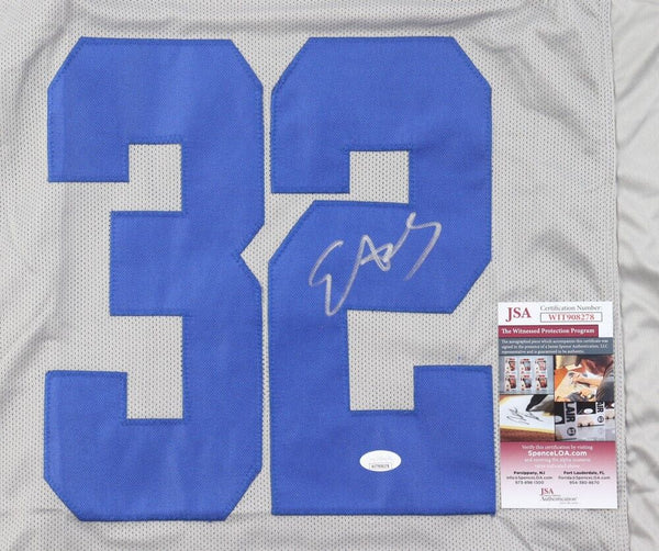 Custom on-field style jersey. Everything sewn on, size XL. Hand-signed in silver paint pen by Edgerrin James (Colts). The autograph includes an official James Spence Authentication (JSA) hologram and matching COA for authenticity purposes. The signing of this item was witnessed by JSA.Authentication: JSA COA