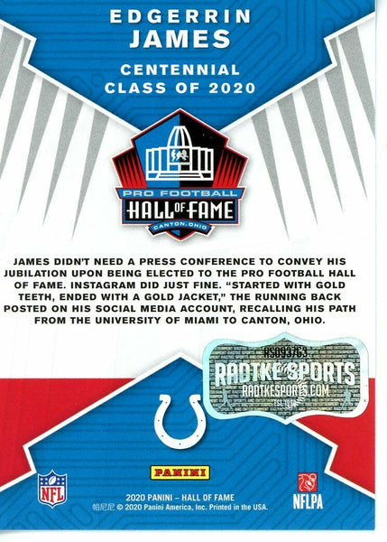 A Indianapolis Colts NFL Card hand signed by Edgerrin James. The item and signature are in excellent condition. In addition to signing his name, Edgerrin also inscribed "HOF 20" on the item. Edgerrin James is a former football running back and was drafted by the Indianapolis Colts fourth overall in the 1999 NFL Draft. Edgerrin played college football at the University of Miami. AUTHENTICATION: The item is accompanied by a Certificate of Authenticity - Serial Numbered and Databased Hologram - Picture of Edgerrin from the signing