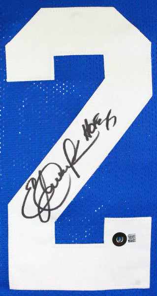 Eric Dickerson Signed Blue Pro Style Jersey w/HOF-Beckett W Hologram *Black THIS IS NOT AN NFL JERSEY. THIS HAS NO TAGS, NO LOGOS, NO EMBLEMS. This is an Eric Dickerson of the Indianapolis Colts hand autographed custom made (Non Name Brand) authentic style (stitched letters and numbers) jersey inscribed with "HOF". This item has a Beckett Witnessed Authentication, which comes with a Beckett numbered hologram and a QR code for verification. You can view this item on the Beckett Authentication website, it shows when and where the item was signed. It was signed either at a public autograph appearance or a private signing. This is a stock photo of the item. Although you may not receive this exact item, the item you receive is virtually identical, brand new, and in great shape. Jersey size is XL.