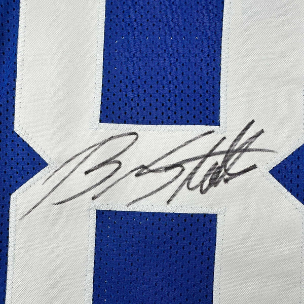 Framed Autographed/Signed Brandon Stokley 33x42 Indianapolis Blue Jersey JSA COA The item is professionally framed and matted with two 5x7 photos, measures 35 inches by 39 inches and is ready to be hung in your man cave! Photo and matting requests can be made.