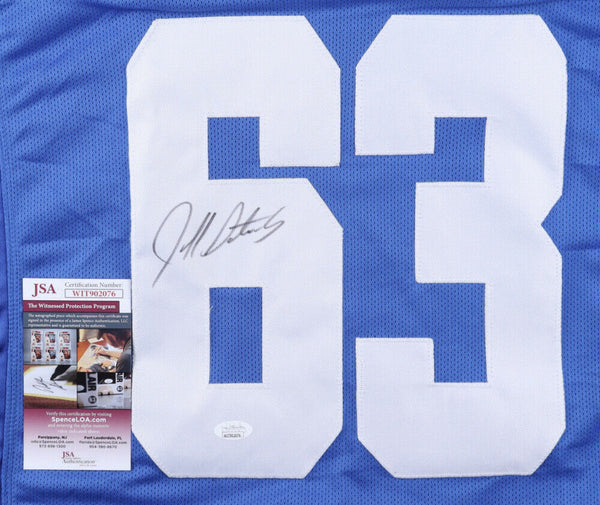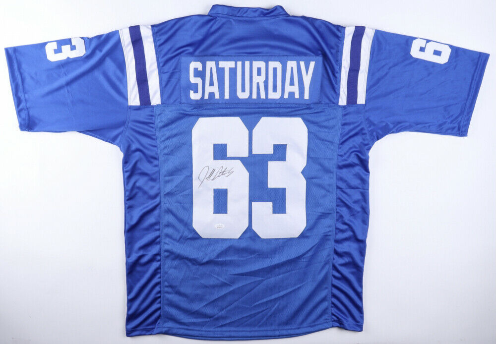 Custom on-field style jersey. Everything is sewn on, size XL. Hand-signed in black Sharpie pen by Jeff Saturday. The lot / autograph(s) includes an official James Spence Authentication (JSA) hologram and matching COA for authenticity purposes. The signing of this item was witnessed by JSA.Authentication: JSA COA