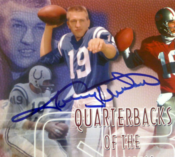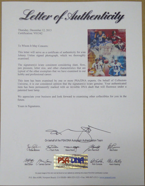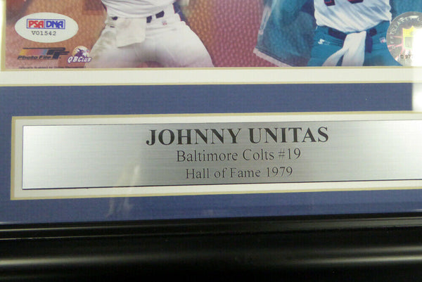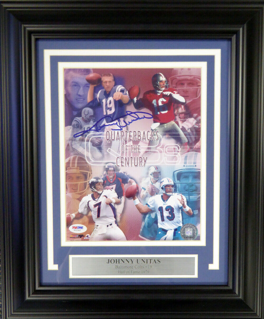 This is a framed 8x10 photo, approximately 15x18 with the frame, that has been hand signed by Johnny Unitas. It has been authenticated by PSA/DNA and comes with their sticker and matching full page certificate of authenticity.