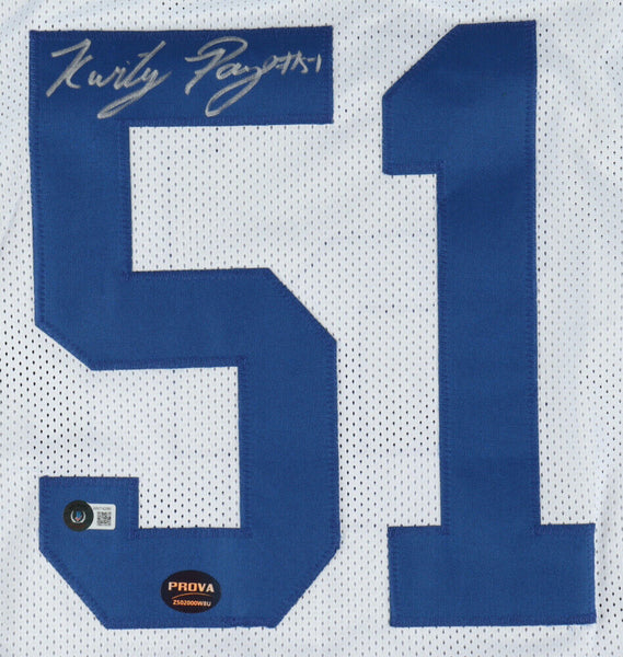 Custom on-field style jersey. Everything is sewn on, size XL. Has been hand-signed by Kwity Paye.The lot / autograph(s) includes an official Beckett Authentication Services serially numbered hologram for authenticity purposes. The signing of this item was witnessed by Beckett.Authentication: Beckett Hologram