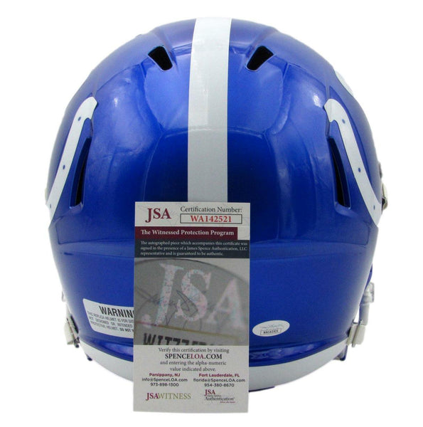 Marvin harrison hof signed/autographed indianapolis colts flash blue full size replica football helmet. this helmet is authenticated by jsa and includes their tamper-proof hologram sticker and certificate of authenticity.