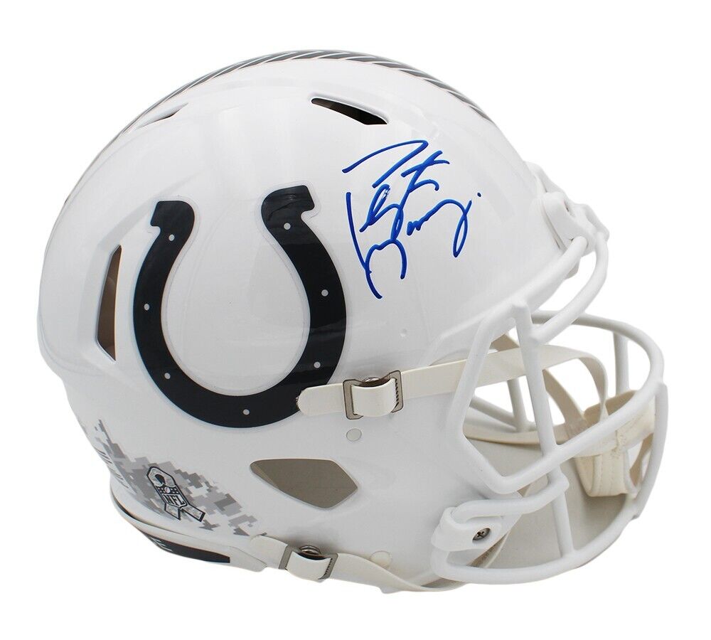 An Indianapolis Colts Speed Authentic Salute to Service 3 NFL Helmet hand signed by Peyton Manning. The item and signature are in excellent condition. Peyton was drafted into the NFL in 1998. He is a 2x Super Bowl champion, and is a Super Bowl MVP. Peyton was the 5x NFL MVP. He was also the 2x NFL Offensive Player of the Year. AUTHENTICATION: The item is accompanied by a Fanatics Authentic Serial Numbered and Databased Hologram