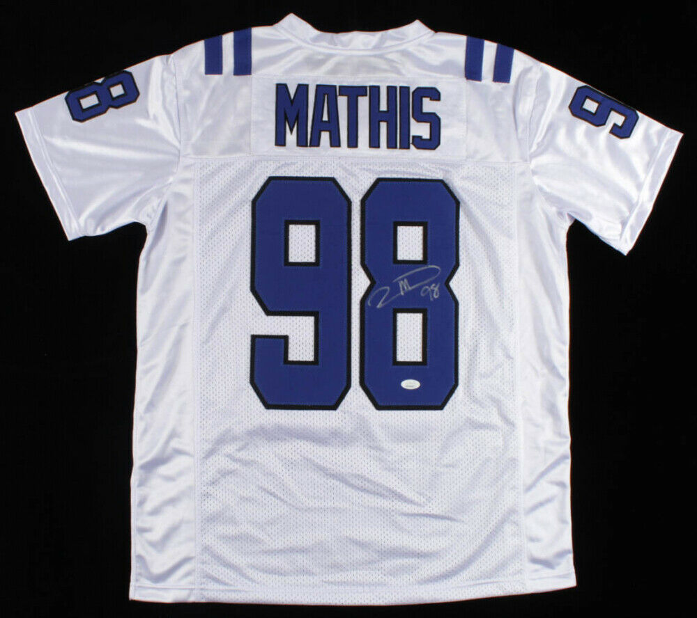 Custom on-field style jersey. Everything is sewn on, size XL. Hand-signed in silver paint pen by Robert Mathis. The lot / autograph(s) includes an official James Spence Authentication (JSA) hologram and matching COA for authenticity purposes.Authentication: JSA COA