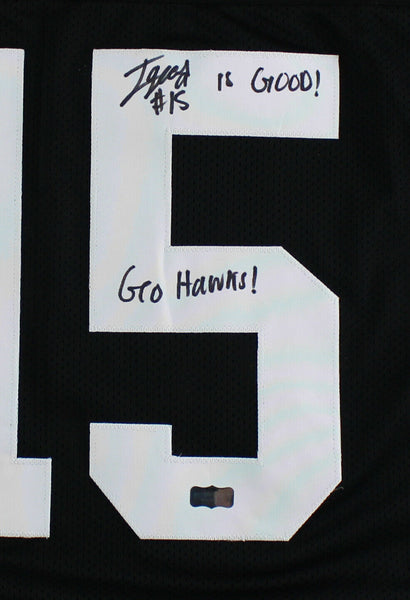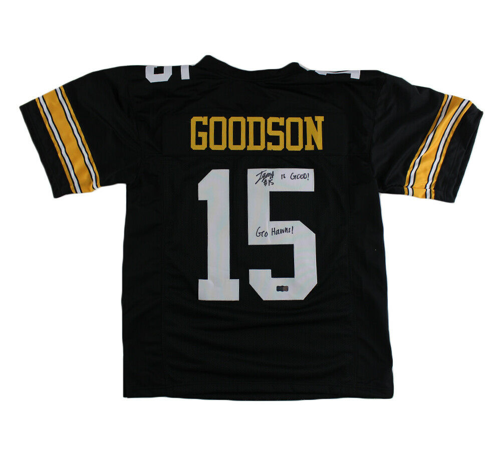 A Iowa Custom Black Jersey hand signed by Tyler Goodson. The item and signature are in excellent condition. In addition to signing his name, Tyler also inscribed "Go Hawks & Is Good" on the item. Tyler was a First team All-Big Ten (2020). Tyler is a Running Back. AUTHENTICATION: The item is accompanied by a Certificate of Authenticity, Serial Numbered and Databased Hologram, & Picture of Tyler from the Signing