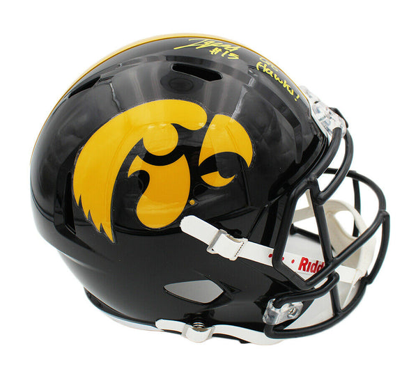 A Iowa Hawkeyes Speed Replica NCAA Helmet hand signed by Tyler Goodson. The item and signature are in excellent condition. In addition to signing his name, Tyler also inscribed "Go Hawks" on the item. Tyler was a First team All-Big Ten (2020). Tyler is a Running Back. AUTHENTICATION: The item is accompanied by a Certificate of Authenticity, Serial Numbered and Databased Hologram, & Picture of Tyler from the Signing