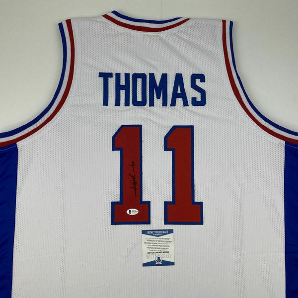 Autographed/Signed ISIAH THOMAS Detroit White Basketball Jersey Beckett BAS COA Jersey has no brand names or logos. This is a custom jersey and was not manufactured by or in any manner associated with any professional sports league or manufacturer. This custom jersey carries no professional sports league designation. The item is intended to be an autographed collectible. The custom jersey displays the name and number of the player. This item in no way is affiliated with or connected to any professional sports organization. Size is XL.