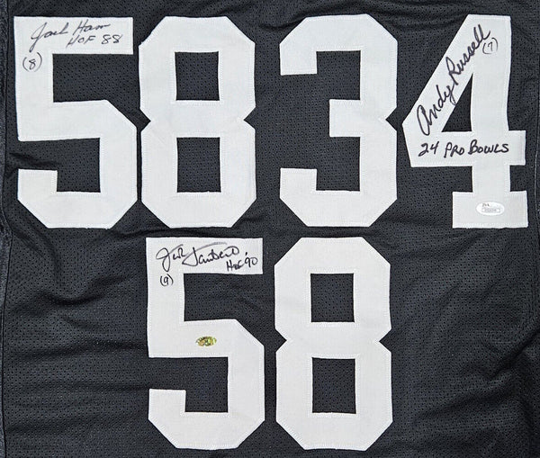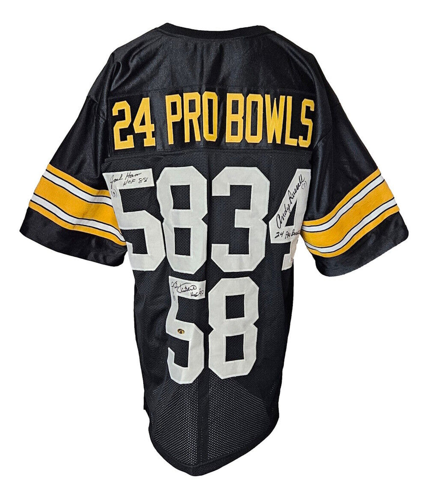 Featured is a Jack Ham, Jack Lambert, and Andy Russell signed custom black 24 pro style football jersey in which they added the "24 Pro Bowls, HOF 88, and HOF 90" inscriptions. This jersey was hand signed by Jack Ham, Jack Lambert, and Andy Russell and has been authenticated by JSA authentication services. Included with the jersey is a JSA hologram only. This jersey would make a great addition to any sports memorabilia collection. This jersey has hand sewn numbers and letter and has NO logos or any affiliation with any manufacturer or team. It is simply intended as an autographed collectible.. SPECIFICATIONS Autographed By: Jack Ham Team: Pittsburgh Steelers Sport: Football Authentication: James Spence Authentication (JSA)