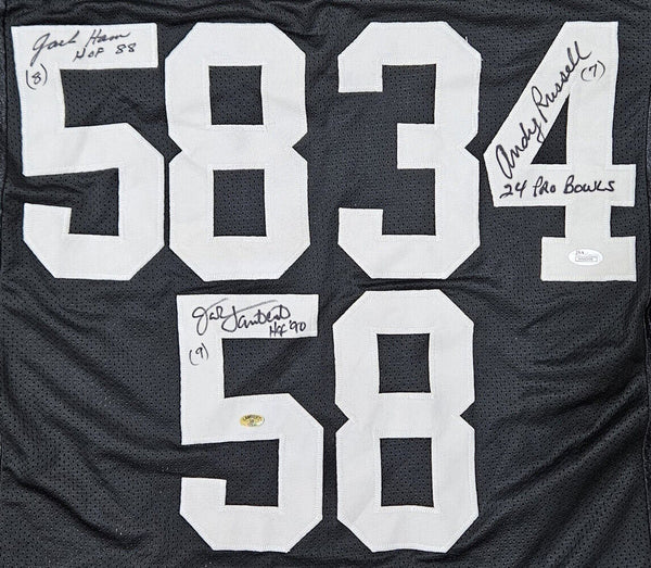 Featured is a Jack Ham, Jack Lambert, and Andy Russell signed custom black 24 pro style football jersey in which they added the "24 Pro Bowls, HOF 88, and HOF 90" inscriptions. This jersey was hand signed by Jack Ham, Jack Lambert, and Andy Russell and has been authenticated by JSA authentication services. Included with the jersey is a JSA hologram only. This jersey would make a great addition to any sports memorabilia collection. This jersey has hand sewn numbers and letter and has NO logos or any affiliation with any manufacturer or team. It is simply intended as an autographed collectible.. SPECIFICATIONS Autographed By: Jack Ham Team: Pittsburgh Steelers Sport: Football Authentication: James Spence Authentication (JSA)