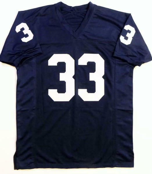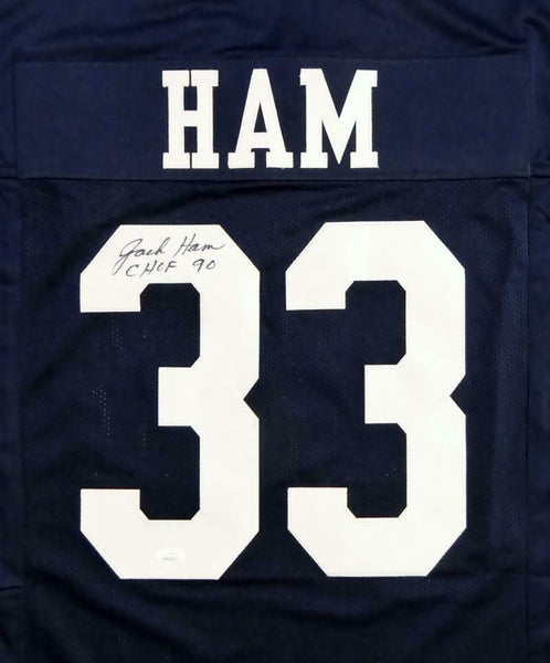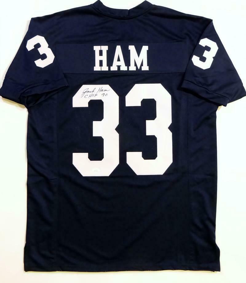 Jack Ham Autographed Navy Blue College Style Jersey W/ CHOF- JSA W Auth *TL3 THIS IS NOT AN NCAA JERSEY. THIS HAS NO TAGS, NO LOGOS, NO EMBLEMS. This is a Hand Autographed Jersey of Jack Ham. This is Custom Made (Non Name Brand) Authentic Style (Stitched Letters and Numbers) Jersey. This item has a James Spence Witness Protection Authentication, which Comes with a JSA #'ed Sticker and a Matching JSA COA. You can view this item on the SpenceLOA website and it shows when and where the item was signed. It was signed either at a public autograph appearance or a Private Signing. This is a stock photo of the item. Although you may not receive this exact item, the item you receive is virtually identical and brand new in great shape.Jersey Size is XL.