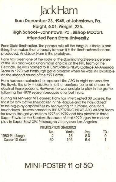 Jack Ham Autographed Pittsburgh Steelers Mini Poster HOF Beckett 46185