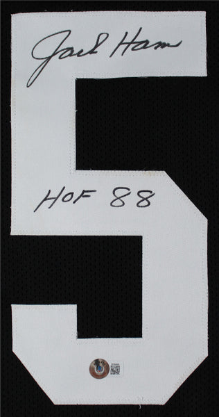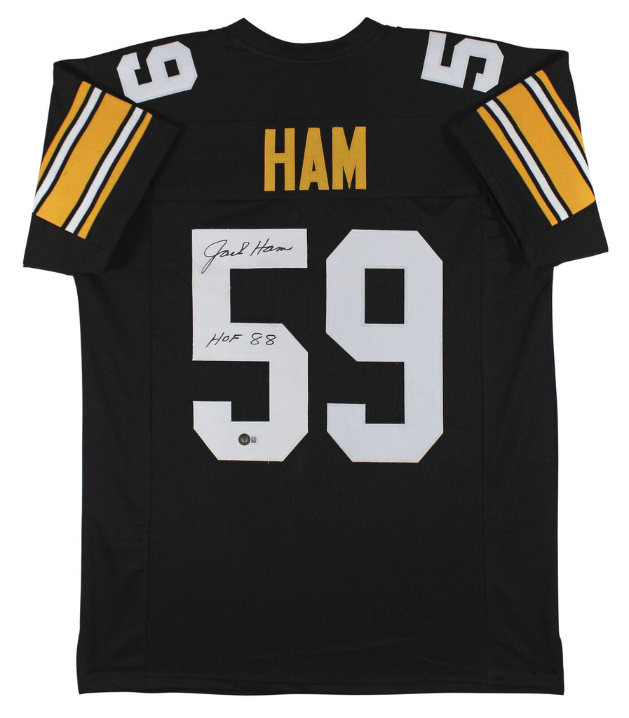 This Autographed Black Pro Style Jersey with the inscription of "HOF 88" has been Personally Signed by Jack Ham of the Pittsburgh Steelers. This item is 100% Authentic to include a hologram by Beckett Authentication Services. This item will come with an affixed Beckett Authentication Services (BAS) authentication sticker, which includes a scannable QR code to verify authenticity. Please note that Beckett no longer provides serial-numbered COA cards, and the attached BAS sticker will serve as the complete authentication for this item. We conducted an autograph signing with Jack Ham where multiples of the same item were signed. While the photographs are representative of this item, the size, placement and strength of the signature may vary. Each item is hand signed, therefore, each autograph is unique. This item can be verified through BAS. This is a X-Large sized, non-branded, custom-stitched Jersey.