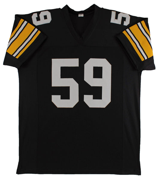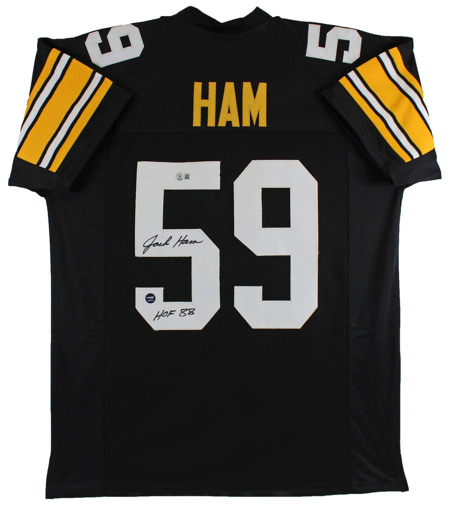 This Autographed Black Pro Style Jersey with the inscription of "HOF 88" has been Personally Signed by Jack Ham of the Pittsburgh Steelers. This item is 100% Authentic to include a Certificate of Authenticity (COA) / hologram by Beckett Authentication Services. This is a BAS Witnessed Protection Program item which means a Beckett Authentication Service representative was present when this item was being signed. We conducted an autograph signing with Jack Ham where multiples of the same item were signed. While the photographs are representative of this item, the size, placement and strength of the signature may vary. Each item is hand signed, therefore, each autograph is unique. This item can be verified through BAS Witnessed. This is a X-Large sized, non-branded, custom-stitched Jersey.