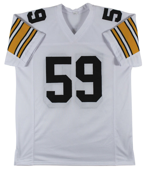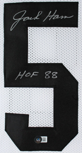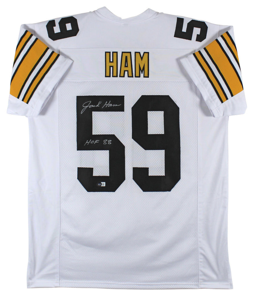 This Autographed White Pro Style Jersey with the inscription of "HOF 88" has been Personally Signed by Jack Ham of the Pittsburgh Steelers. This item is 100% Authentic to include a hologram by Beckett Authentication Services. This item will come with an affixed Beckett Authentication Services (BAS) authentication sticker, which includes a scannable QR code to verify authenticity. Please note that Beckett no longer provides serial-numbered COA cards, and the attached BAS sticker will serve as the complete authentication for this item. We conducted an autograph signing with Jack Ham where multiples of the same item were signed. While the photographs are representative of this item, the size, placement and strength of the signature may vary. Each item is hand signed, therefore, each autograph is unique. This item can be verified through BAS. This is a X-Large sized, non-branded, custom-stitched Jersey.