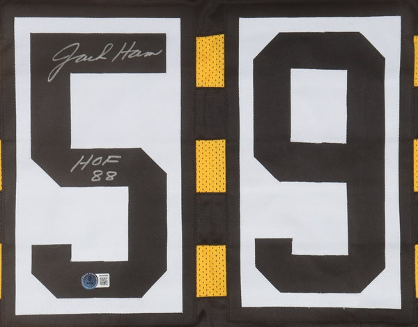 Custom on-field style jersey. Everything is sewn on, size XL. Hand-signed in silver paint pen by Jack Ham (Pittsburgh Steelers HOF). The autograph includes an official Beckett Authentication Services serially numbered scannable hologram and QR Code Card for authenticity purposes. The signing of this item was witnessed by Beckett.Authentication: Beckett Scannable Hologram with QR Code Card Shop our ebay store / Friendly Confines Collectibles for thousands of different autographed jerseys