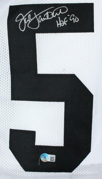 Jack Lambert Autographed White Pro Style Jersey w/HOF-Beckett W Hologram *Silver THIS IS NOT AN NFL JERSEY. THIS HAS NO TAGS, NO LOGOS, NO EMBLEMS. This is a Hand Autograph of Jack Lambert on a custom made (Non Name Brand) authentic style jersey with stitched letters and numbers. Inscribed HOF. This item has a Beckett Witnessed Authentication, which comes with a Beckett #'ed hologram and a Generic Beckett certificate of authenticity. You can view this item on the Beckett website and it shows when and where the item was signed. It was signed either at a public autograph appearance or a private signing. This is a stock photo of the item. Although you may not receive this exact item, the item you receive is virtually identical and brand new in great shape. Jersey size is XL.