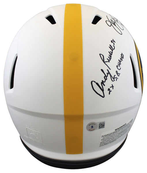 This Autographed Alternate Lunar Riddell Authentic Full Size Speed Proline Helmet with the inscription of "2x SB Champs (Russell), HOF 88 (Ham), HOF 90 (Lambert)" has been Personally Signed by Jack Lambert, Jack Ham & Andy Russell of the Pittsburgh Steelers. This item is 100% Authentic to include a hologram by Beckett Authentication Services. This item will come with the new Beckett Authentication hologram that has a scannable QR code rather than the traditional COA. If you would like to have a COA, you are welcome to reach out to Beckett for a printed certification once you receive your item. This is a BAS Witnessed Protection Program item which means a Beckett Authentication Service representative was present when this item was being signed. We conducted an autograph signing with Jack Lambert, Jack Ham & Andy Russell where multiples of the same item were signed. While the photographs are representative of this item, the size, placement and strength of the signature may vary. Each item is hand signed, therefore, each autograph is unique. This item can be verified through BAS Witnessed.