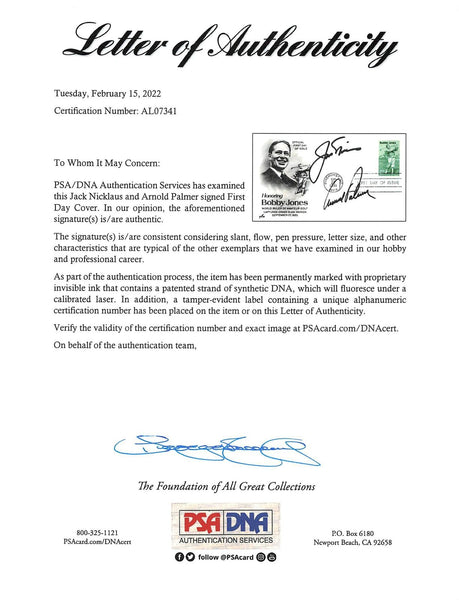 This Autographed Postmarked September 22, 1981 3.5x6.5 Fist Day Cover Envelope has been Personally Signed by Jack Nicklaus & Arnold Palmer. This item is 100% Authentic and comes with a PSA/DNA Certification Card and a matching numbered Hologram. The authenticity can be verified on Professional Sports Authenticator website.
