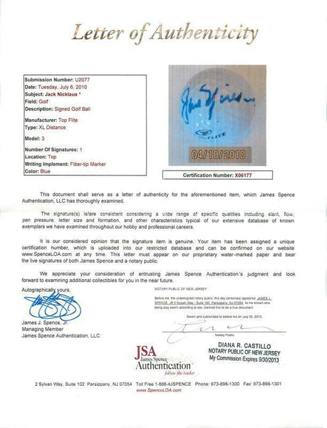 This JACK NICKLAUS AUTHENTIC SIGNED TOP FLITE GOLF BALL AUTOGRAPHED JSA #X06177 has been certified authentic. It will include the JSA numbered hologram and matching Certificate of Authenticity.