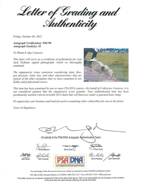 This is a Auto Graded Gem 10! Authentic Signed 16X20 Photo that has been Personally Signed & Autographed by Jack Nicklaus. This item is 100% Authentic to include a Certificate of Authenticity (COA) / hologram by PSA/DNA #Y06790.We offers a 100% Lifetime Guarantee on all Autographed & Signed Jack Nicklaus memorabilia.