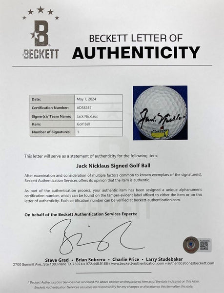 Featured is a Jack Nicklaus signed Masters logo Strata golf ball. This ball has been hand signed Nicklaus and comes with the Beckett hologram and letter of authenticity. This ball would make a great addition to any sports memorabilia collection! SPECIFICATIONS Autographed By: Jack Nicklaus Team: Sport: Golf-PGA Authentication: Beckett Grading Services