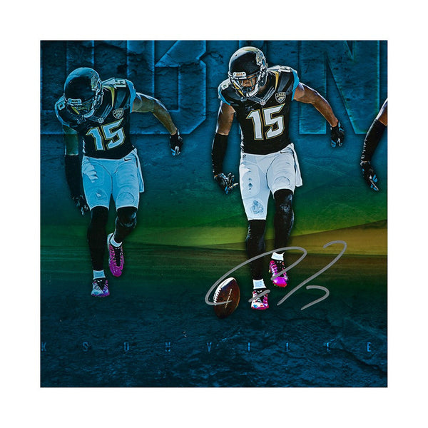 With a few consecutive healthy drafts and the development of some key position players, the Jacksonville Jaguars are poised to make noise toward a postseason run. One of the most important components of that drive toward the playoffs is wide receiver Allen Robinson. The former Penn State star routinely draws the opposition's top cover corner, often times receiving bracket coverage thanks to his immense talents as a pass-catcher. In Week 3 of the 2016 season, he picked up right where he left off from the previous campaign as he hauled in two touchdowns among his seven catches in a narrow loss to the Ravens. He's used to celebrating in the end zone, witnessed by his 14 TDs in 2015. Robinson has signed this limited edition (115) TD Catch Celebration 30" x 15" designed image in silver paint pen. His signature is deemed authentic by virtue of Upper Deck Authenticated's Five Step Process.