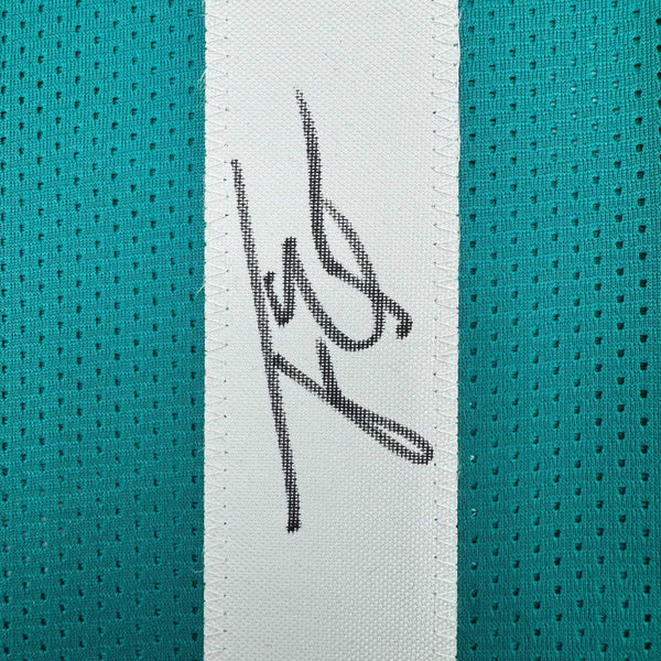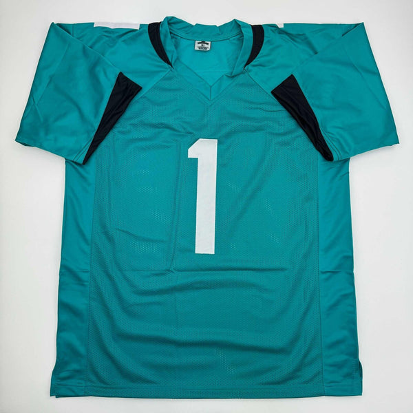 Autographed/Signed Travis Etienne Jr. Jacksonville Teal Jersey Beckett BAS COA Jersey has no brand names or logos. This is a custom jersey and was not manufactured by or in any manner associated with any professional sports league or manufacturer. This custom jersey carries no professional sports league designation. The item is intended to be an autographed collectible. The custom jersey displays the name and number of the player. This item in no way is affiliated with or connected to any professional sports organization. Size is XL.