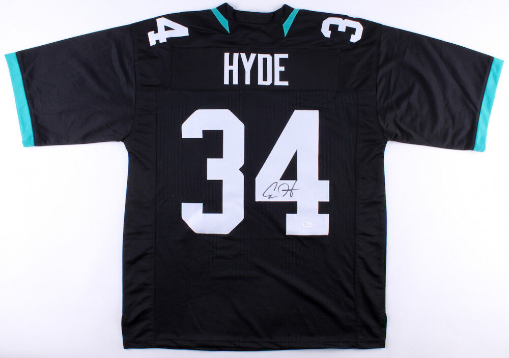 Custom on-field style jersey, everything sewn on, size XL. Hand-signed in black felt-tip pen by Carlos Hyde. The lot / autograph(s) includes an official James Spence Authentication (JSA) hologram and matching COA for authenticity purposes. The signing of this item was witnessed by JSA.Authentication: JSA COA Check out over 6,000 other autographed items at our E Bay Store : Friendly Confines Collectibles. Save on Shipping, 2nd & 3rd Jerseys SHIP FREE !! Thanks for looking!