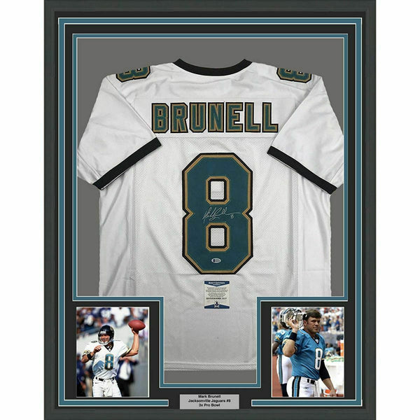 FRAMED Autographed/Signed MARK BRUNELL 33x42 Jacksonville White Jersey BAS COA The item is professionally framed & matted with two 8x10 photos, measures 33"x42" and is ready to be hung in your man cave! NOTE: COA card will be mounted on the back of the frame, not inside it on top of the jersey as seen in the picture.