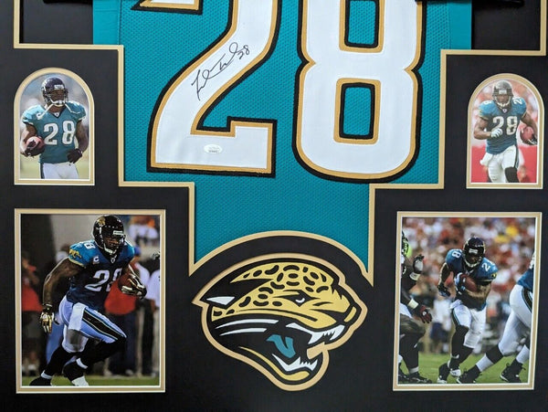 Custom Framed Fred Taylor hand signed Jacksonville Jaguars style custom jersey.JSA Hologram and COAThe authentication is from JSA. This signature is authenticated by a representative of JSA! 100% AUTHENTIC!!! The jersey has fully stitched numbers on the front and back. It is a great item and a must for all great sports fans!This item is professionally framed, it measures 32"x40" inside , 42"x34" outside , using UV protective Acrylic glass for safe keeping and safe transport, team color matting, black moulding and hanging hooks on the back. All additional items in frame seen in pictures included. 100% ready to hang in your fan cave.