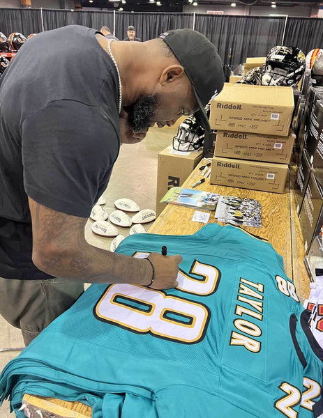 Fred Taylor Autographed/Signed Pro Style Jersey Teal Insc. Beckett 40941 The number in the listing title is just an inventory sku for our records and is not the authentication number. The item pictured is a stock photo unless otherwise noted. This is a Pro Style Teal Jersey with sewn on numbers that was personally autographed by Fred Taylor with "Pride of the Jaguars" inscription. Includes a certificate of authenticity from Beckett Authentication Services (BAS) and Denver Autographs.