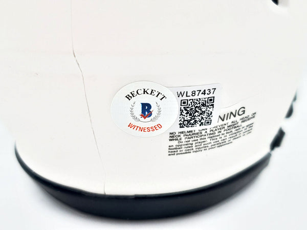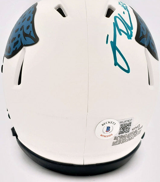 This is a Jacksonville Jaguars Lunar Eclipse White Speed Mini Helmet that has been hand signed by James Robinson. The Eclipse helmets are very delicate and often have some marks or scratches on them. This item has been certified authentic by Beckett Authentication (BAS) and comes with their tamper-proof QR Code sticker that can be verified on the Beckett-authentication.com.