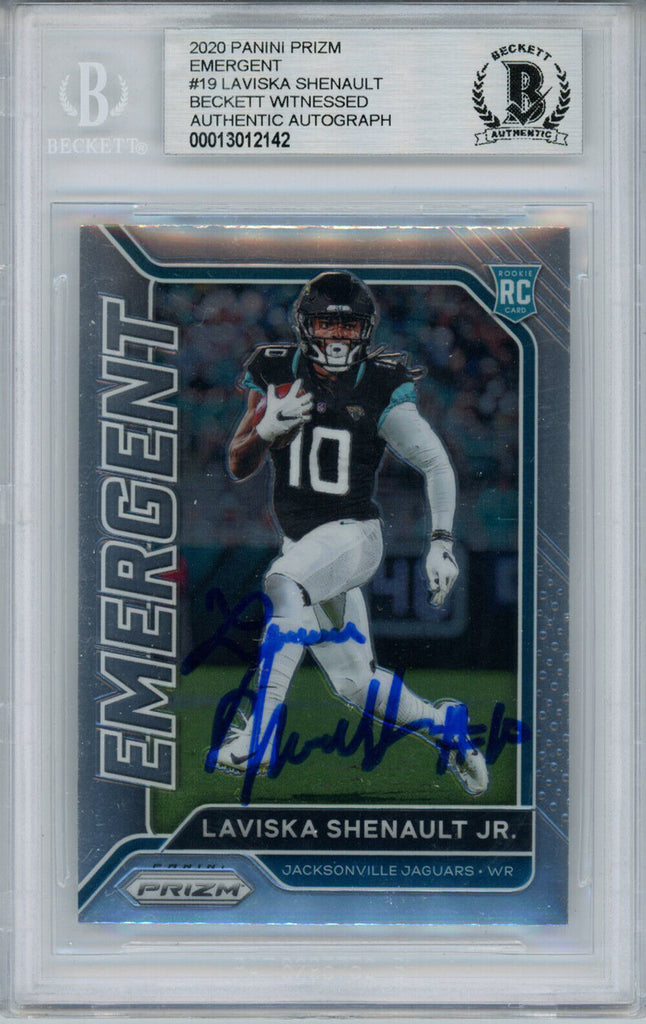 Laviska Shenault Autographed 2021 Panini Prizm #19 Trading Card BAS Slab 33254 The number in the listing title is just an inventory sku for our records and is not the authentication number. This is a 2021 Panini Prizm #19 trading card that was personally autographed by Laviska Shenault. This has been professionally slabbed by Beckett Authentication Services (BAS) and includes a certificate of authenticity from Denver Autographs.