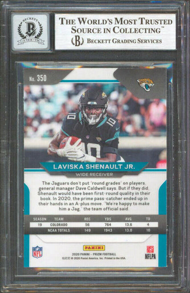 This Autographed Auto Graded Gem Mint 10! 2020 Panini Prizm #350A Rookie Card has been Personally Signed by Laviska Shenault of the Jacksonville Jaguars. This item is 100% Authentic, it comes slabbed and authenticated by Beckett Authentication Services. This is a stock item. We conducted an autograph signing with Laviska Shenault and we have several of these available. The one you will receive will be of equal quality to the one pictured. This item can be verified through BAS Slabbed.