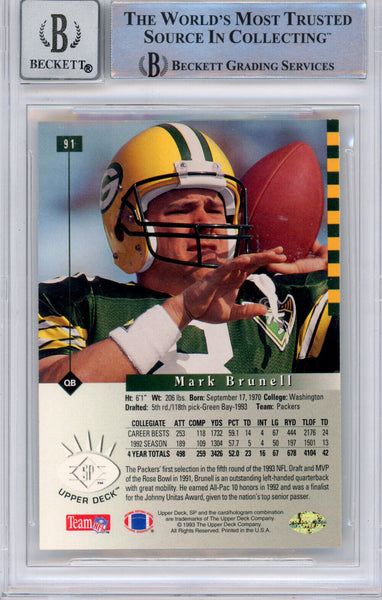 Mark Brunnell Signed 1993 UD SP #91 (Grade 10) Rookie Trading Card BAS Slab 39929 The number in the listing title is just an inventory sku for our records and is not the authentication number. The item pictured is a stock photo unless otherwise noted. This is an Autographed Grade 10 Trading Card by Mark Brunnell. Includes a certificate of authenticity from Beckett Authentication Services (BAS) and Denver Autographs.
