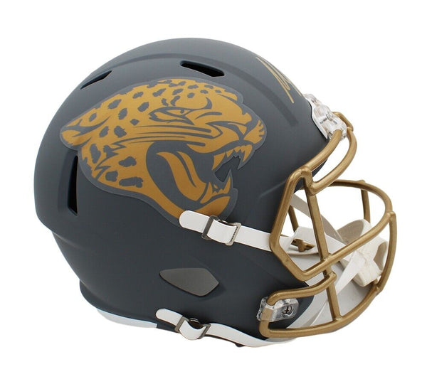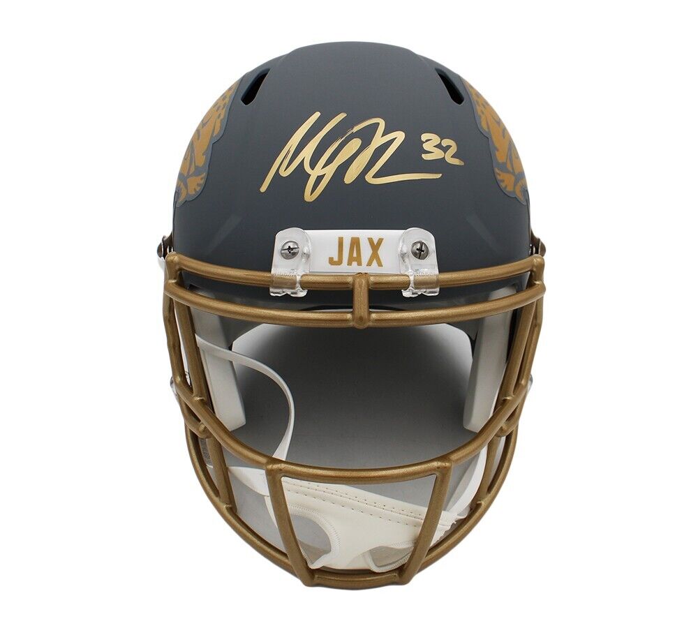 A Jacksonville Jaguars Speed Replica Slate NFL Helmet hand signed by Maurice Jones-Drew. The item and signature are in excellent condition. Maurice is a former running back. He played college football for the UCLA Bruins and earned unanimous All-American honors. Jones-Drew was selected by the Jacksonville Jaguars in the second round of the 2006 NFL Draft, 60th overall, was named to the Pro Bowl three times, and led the NFL in rushing yards in 2011. He played his first eight seasons with the Jaguars, through 2013. In his final season in 2014, he played for the Oakland Raiders. AUTHENTICATION: The item is accompanied by a Beckett Serial Numbered and Databased Hologram.