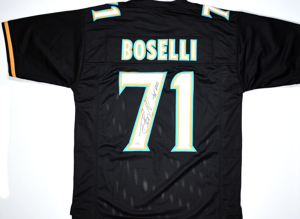Tony Boselli Autographed Black Pro Style Jersey w/ HOF - Beckett W Hologram *Black THIS IS NOT AN NFL JERSEY. THIS HAS NO TAGS, NO LOGOS, NO EMBLEMS. This is a Tony Boselli of the Jacksonville Jaguars hand autographed custom made (non name brand) authentic style jersey (stitched letters and numbers) with "HOF" inscription. This item has a Beckett Witnessed Authentication, which comes with a numbered hologram and a QR code for verification. You can view this item on the Beckett Authentication website and it shows when and where the item was signed. It was signed either at a public autograph appearance or a private signing. This is a stock photo of the item. Although you may not receive this exact item, the item you receive is virtually identical, brand new, and in great shape. Jersey size is XL.