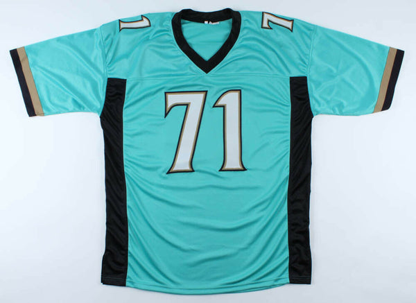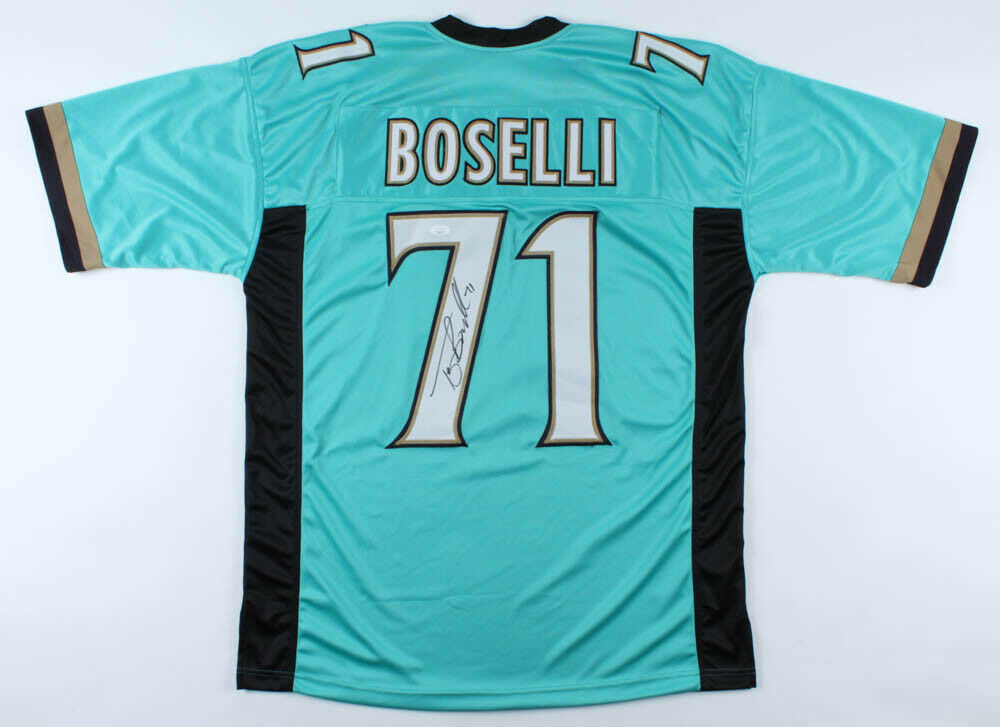 Custom on-field style jersey. Everything sewn on, size XL. Hand-signed in black paint pen by Tony Boselli. The lot / autograph(s) includes an official James Spence Authentication (JSA) hologram and matching COA for authenticity purposes. Authentication: JSA COA