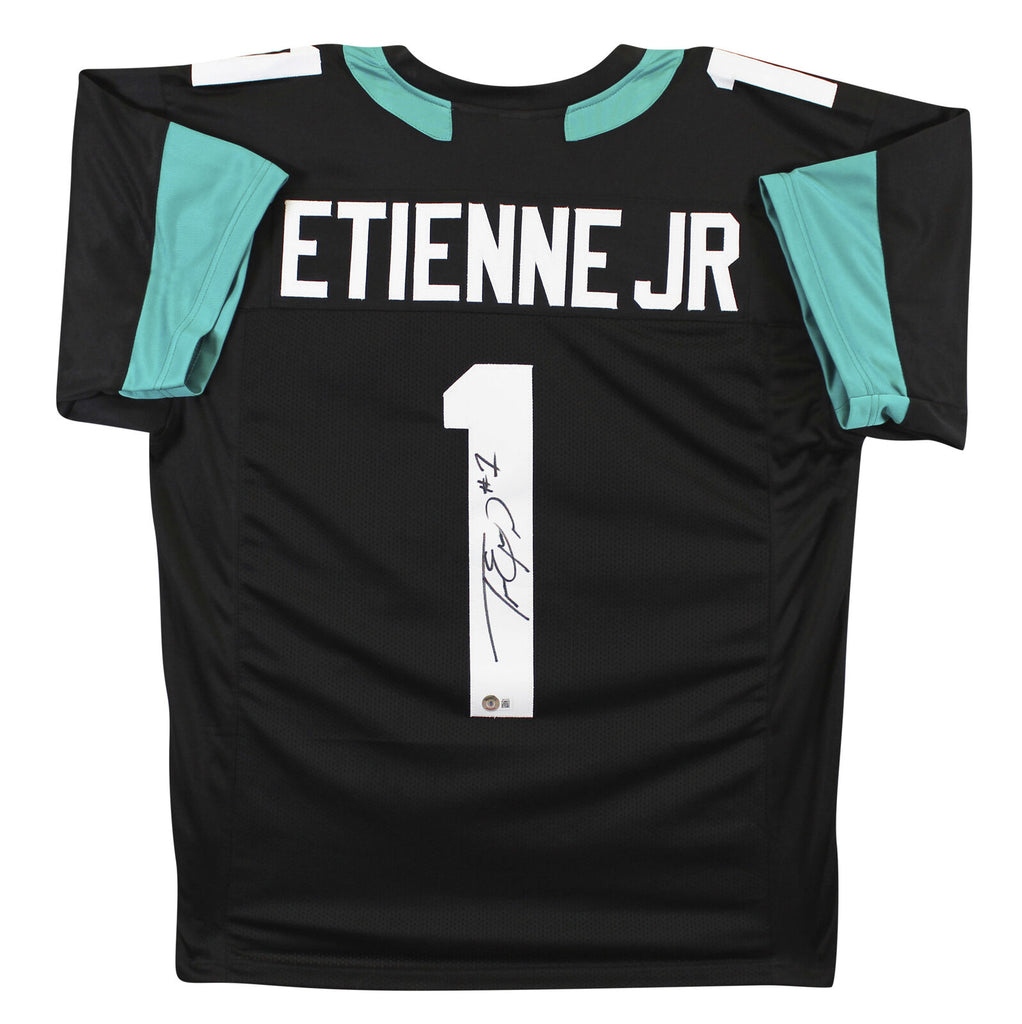 This Autographed Black Pro Style Jersey has been Personally Signed by Travis Etienne of the Jacksonville Jaguars. This item is 100% Authentic to include a hologram by Beckett Authentication Services. This item will come with an affixed Beckett Authentication Services (BAS) authentication sticker, which includes a scannable QR code to verify authenticity. Please note that Beckett no longer provides serial-numbered COA cards, and the attached BAS sticker will serve as the complete authentication for this item. This is a BAS Witnessed Protection Program item which means a Beckett Authentication Service representative was present when this item was being signed. We have multiples of this same item. While the photographs are representative of this item, the size, placement and strength of the signature may vary. Each item is hand signed, therefore, each autograph is unique. This is a X-Large sized, non-branded, custom-stitched Jersey.